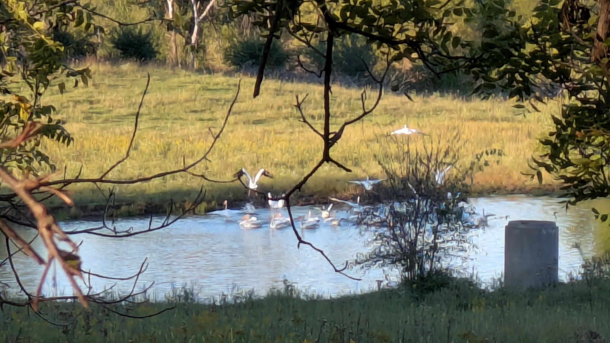 …. No, it wasn’t my birthday Friday evening and it was not a holiday so I was not expecting a present. Friday was the end of the work week and we had headed out to milk cows and goats. I was in the barn milking my first cow and Katy was mixing up some pig feed and Seth came busting in the door, yelling to come and see these strange birds in the goat pen. Everything that Seth sees is worth calling to the world and saying, come and see this new thing I have found so Katy went slowly following a speeding Seth who pointed in disappointment at the pond where nothing seemed any different than any other day and then he saw them circling. Huge white birds with beaks as big as soup ladles – Seth’s strange birds were pelicans. We had seen them once before at the neighbors “wetland’s project” and that was a car stopping, roadside event for us having never seen pelicans up close before. This time they were on our pond and even though they did not stay long, it was a present – so unexpected and so special!